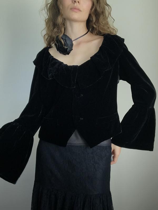 Віскоза+шовк. чорний жіночий жакет з оксамиту per una цікавого дизайну з воланами