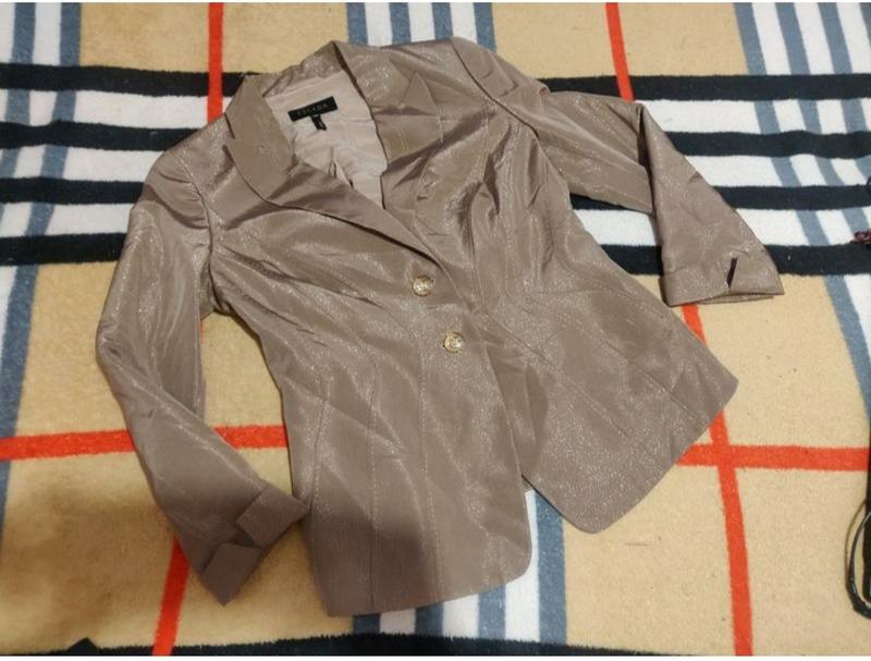 Очень красивый оригинальный пиджак Escada подойдет для торжеств Бежево кофейный цвет с блеском слегка приталенный, есть небольшие подплечники Гудзики нереальны Рукав можно отвести на шелковой подкладке состав Шелк SILK размер 38 38-38см плечи 45см под руками (в покое) 60см длина по спинке 67см удлиненный лацкан спереди 55см рукав Рукав красиво подкатывается в 7/8