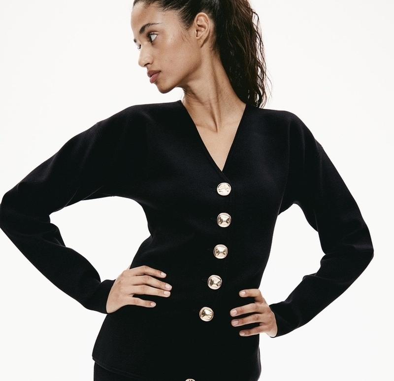 подовжений, приталений кардиган з щильного трикотажу. V-подібний виріз, металеві ґудзики спереду та довгі рукави. Заміри: Напів грудей 48, довжина 66
