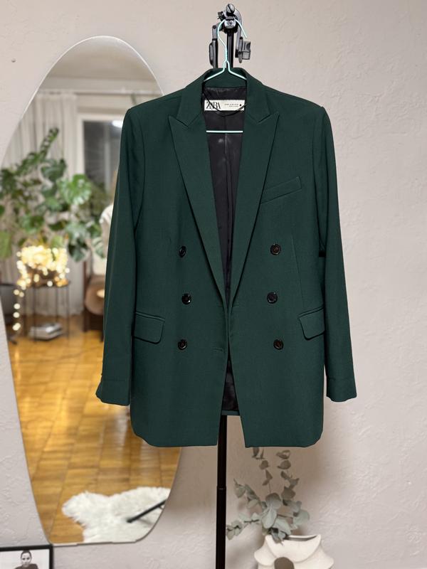 Піджак Zara S/XS смарагдового кольору. Прямий крій, із ледве-помітними витачками, завдяки чому ідеально сідає: як оверсайз, але акуратно. Обережні підплічники красиво тримають форму, додають силуету витонченності. У відмінному стані Довжина 78 см Плечі 37-38 см Полуоб. грудей (від підп. до підп.) 45 см Ширина по низу 50 см Довжина рукава 62 см Є 3 кишені: 2 по боках та один маленький зверху. Розмір вказаний XS. Але піде і на S. Вдягнено на зріст 156 см