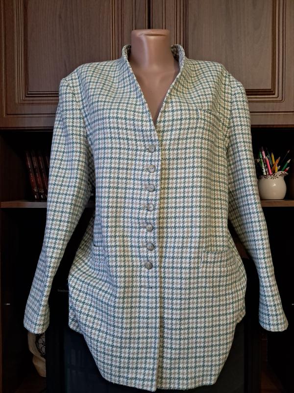 Женский пиджак размер 38 Длина 73см Длина рукава 57см Ширина под подмышками 52см ширина в поясе 50см.Ширина в плечах 42см.Недолики подкошлатален и нет одной пуговицы(но есть на рукавах такие)
