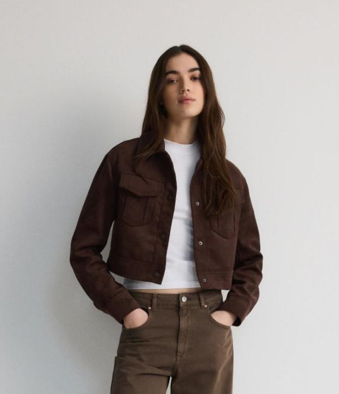 Стильный актуальная модель куртки жакет пиджак шоколадного цвета. Искусственный замш, мягкий. Красивого правильного шоколадного кольору. Размер US 10, подойдет на S. Длина 55, рукав 60, ширина 49