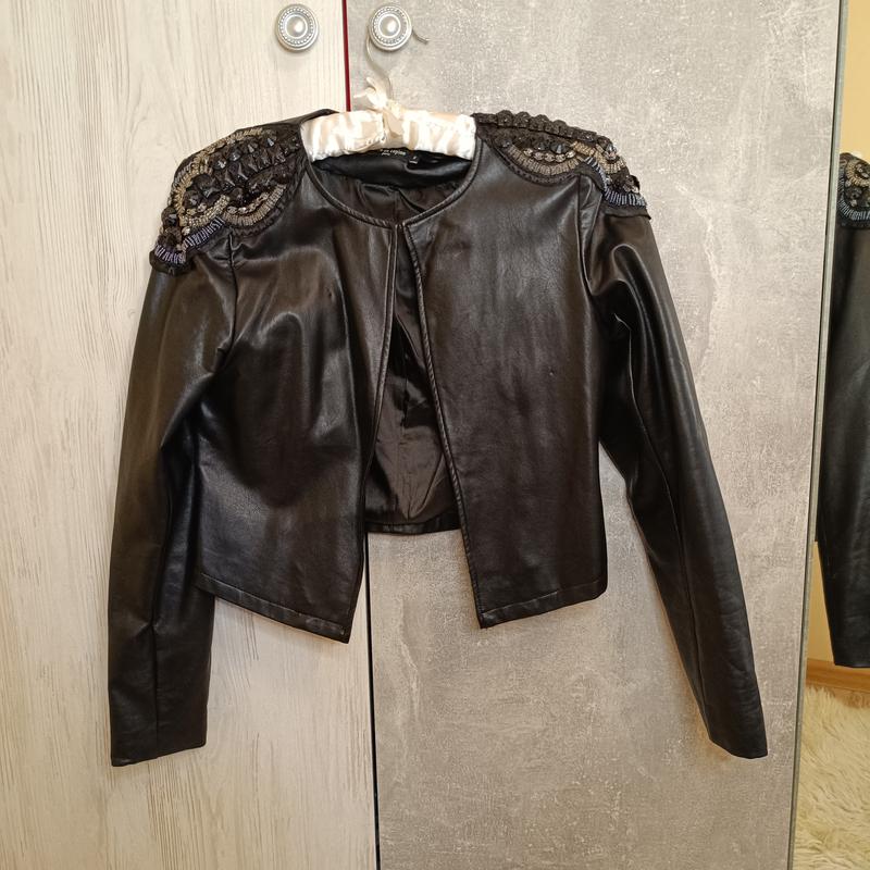 Пиджак из эко кожи укороченный Размер С Длина 45 см Грудь: до 90 см Ширина плечей: 35 см Длина рукава:57 см Состав ткани: 38 rayonne 36 polyurethane 26 fibre