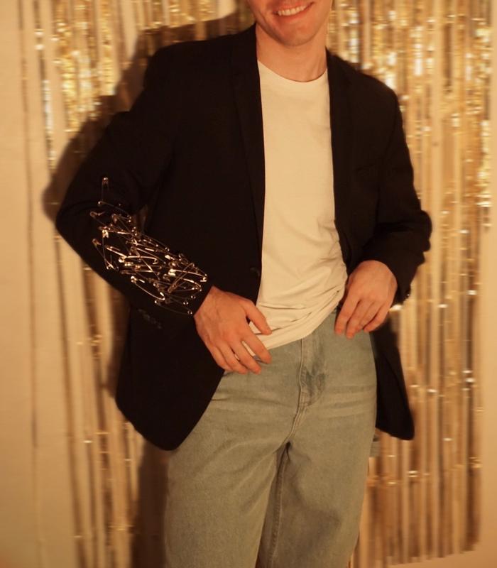 Чорний піджак, приталеного крою, з декоративними шпильками
