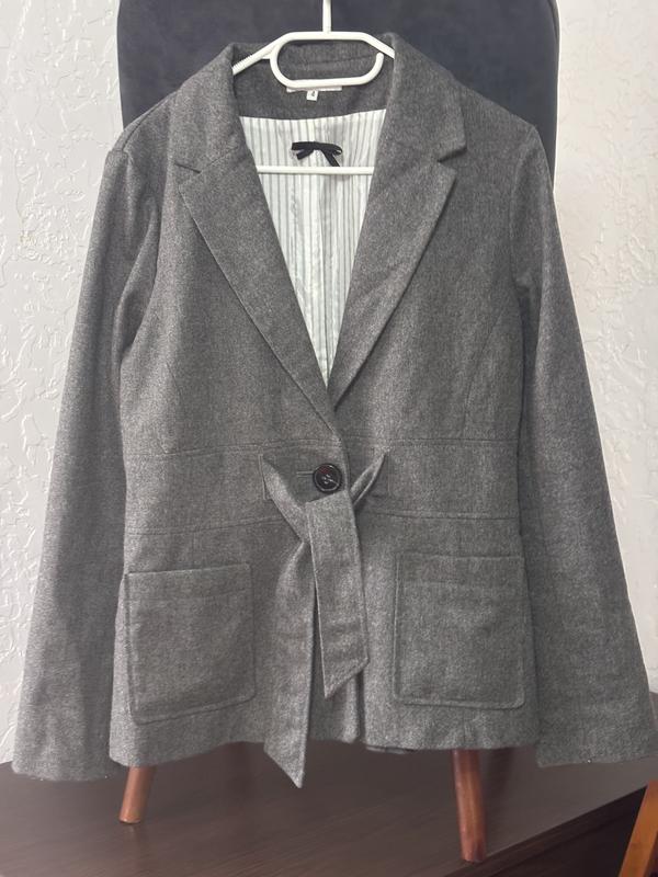 Жіночий вінтажний сірий піджак вільного крою на один ґудзик і завʼязку. У складі 68% шерсті.