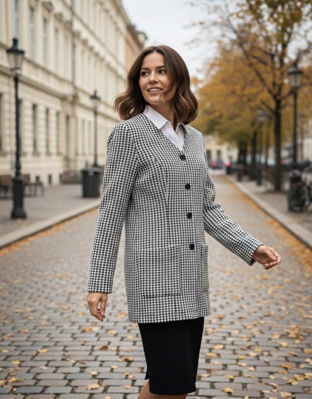 Класичний жіночий жакет C&A в чорно-білу "гусячу лапку". Довгий крій, що ідеально підходить для ділового та повсякденного образу. Еластична тканина забезпечує комфортну посадку. • Стан: В чудовому стані. • Розмір: M (по бірці EUR 38/40). • Склад: 81% акрил, 15% поліестер, 4% еластан (тканина добре тягнеться). Заміри: • Плечі: 40 см • Рукав: 57 см • Пахви (напівобхват): 45 см • Талія (напівобхват): 42 см • Ширина по низу (напівобхват): 50 см • Довжина: 72 см