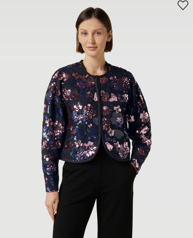 Очень классный и стильный жакет, курточка от бренда Fabienne Chapot в размере 44.Стеганая подкладка голубого цвета, извлекая черного цвета в пайетки синего и розового цвета.Застежка на крючках. длина по спине 60 пОГруди 60 рукав от плеча 65