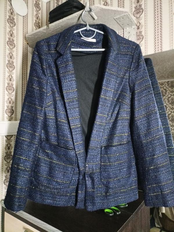 Красивый женский пиджак цвет синий меланж, с люрексом. Есть два кармана. Без застежки. Объем груди до 106 см, длина 68 см, рукав 64 см. Оплата продавцу на карточку.