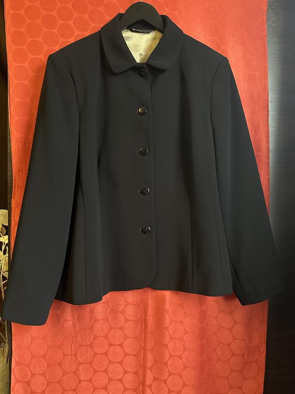 Пів обхват плечей 44 Довжина рукава 61 Пів обхват грудей 56 Пів обхват талії 54 Пів обхват стегон 58 Довжина виробу 65 На підкладці,без карманів Е невеликий дефект в районі плеча,є на останньому фото,не дуже помітно)) Склад тканини дивіться на бірці))