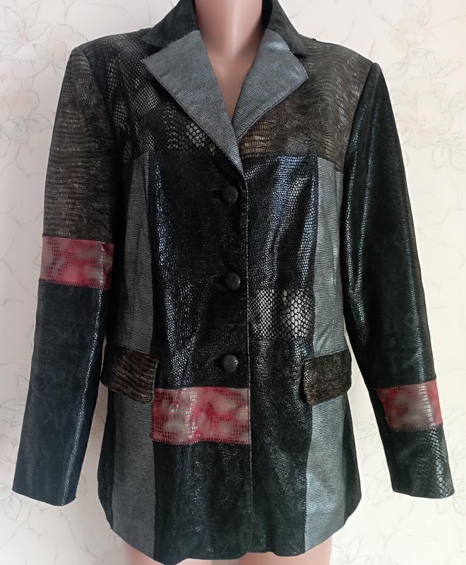 Стильный, комбинированный, удлиненный пиджак в стиле печворк, с тиснением под кожу рептилии, с карманами, плечи 42, ПІГ 53-54, ПИТ 49-50, ПИБ 54, рукав 61, длина изделия 70. Бирка со складом отсутствует.