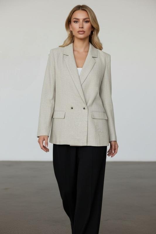 Льняной бежевый пиджак Primark — базовый оверсайз жакет Стильный женский пиджак в актуальном свободном крое. Цвет — нежный бежевый меланж, который идеально сочетается с любыми образами: офис, casual, встречи, прогулки 🌿 Ткань натуральная и приятная: 75% вискоза + 25% лён — дышащий, лёгкий, комфортный материал. Модель двубортная, с двумя пуговицами, аккуратными лацканами и накладными карманами с клапаном. Пиджак сидит свободно, красиво струится и не утяжеляет фигуру. Размер на бирке: UK 10 / EU 38. (р. S/M) Состояние: новое ✔️ По запросу сделаю полные замеры 📏 — пишите! ❗❗❗ Все фото на вешалке — мои собственные, сделаны вручную специально для объявления. Покупка будет именно такой, как на фото!
