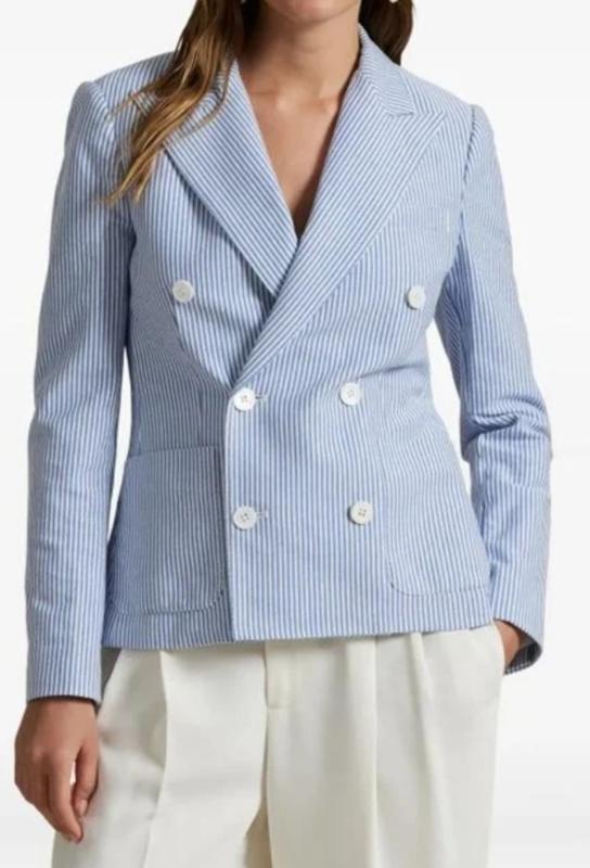 Стильный легкий пиджак двубортный, голубой цвет в белую полоску, свободного кроя, бренд Miss Smith, размер указан 14, состояние идеально