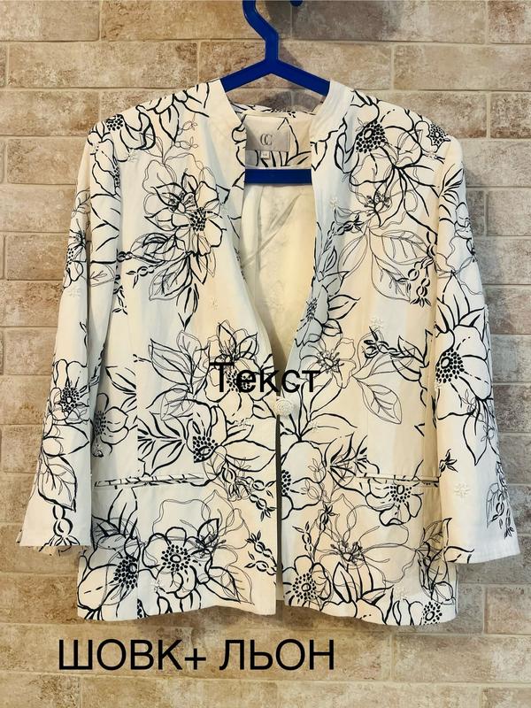 Гарний блейзер з вишуканим складом : 58% шовку, 42 % льону, підклад - ацетат Застібка на один ґудзик, даа кармани ( зашиті) , комір- стійка, нашивки з бісеру .Розмір по бірці 14. Довжина- 63 см, довжина рукава- 49 см, ширина плечей 41 см, пог- 51 см, пос- 55 см. Стан вдг, слідів носіння не має.