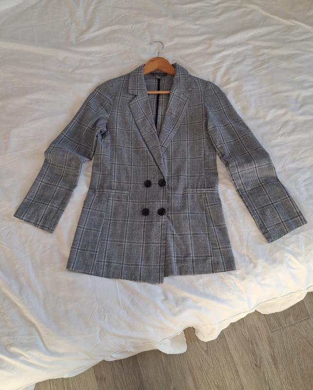 Женский серый пиджак в клетку Размер - 34 Замеры: Полуобхват груди – 42 см Длина по спинке – 69 см Длина рукава - 59 см Ширина плечей – 36 см Ткань - 65% полиэстер 30% коттон 5% вискоза
