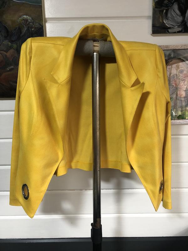 Класний піджак,на рукавах замочки,гарячого жовтого кольору,стан нового,мʼякий ,защіпається на гачок один Дв-51 Др-58 Пог-49