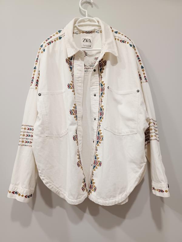 джинсовый жакет, джинсовая рубашка с вышивкой от Zara. удлиненная, закругленный низ, 2 больших накладных кармана, спущенная линия плеча. по наборке размер XL, на М сядет в виде оверсайза.