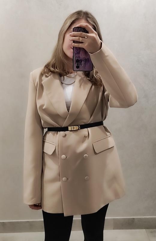 Очень красивый бежевый пиджак прямого кроя, идет удлиненный. Есть карманы. Стан идеален. Размер вказано 10( S), но поддерживается за счет кроя можно и на М. Полуобхват груди -53 длина-79 рукав от плеча-64 Мне лично нравится под пояс, но я рекомендовать бы на больший рост нож у меня ( 160см), потому что на мне он кажется удлиненным и длинный рукав. Одет на параметры 93/72/98, рост 160.