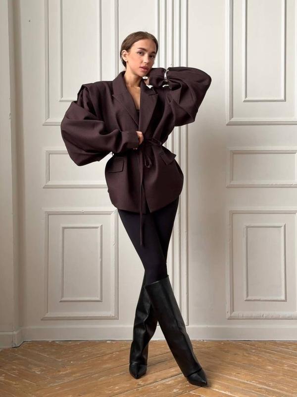 Жакет ▪Код товару: 893 ▪Цена 980 грн🔥 ▪Ткань:костюмка+подкладка ▪Цвета:черный,графит,бордо,шоколад ▪Размер:S-L(Универсал) Параметри товару: Длина-71 см Рукав-62см ОГ-118 см 📌Топ продаж. Очень стильный жакет, в трендовых цветах. Необычный крой, шировые рукава, свободный, пояс из основной ткани🥰