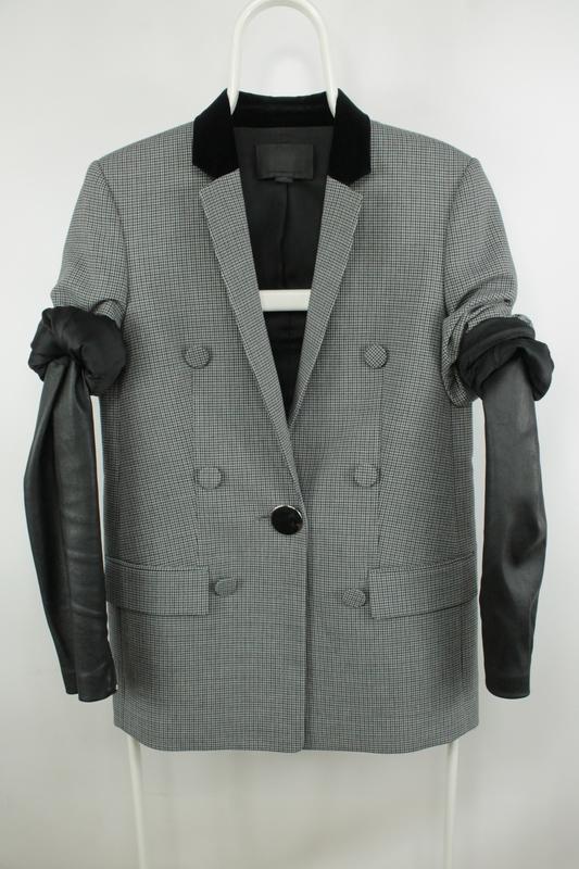 Стильный дизайнерский пиджак блейзер Alexander Wang Leather Trimmed Houndstooth Woven Blazer Новое состояние, без дефектов Размер 4 S Цена 7500 грн Плечи 42 ПОГ между подмышками 48 Рукав от плеча 62.5 Длина по спине от воротника 74 Состав: 52% поле, 26% вискоза, 20% шерсть, 2% эластан. Контрастна тканина 1: 100% бавовна. Контрастна тканина 2: 100% овчина. Подкладка: 100% поле. Изготовлено в Китае. Только химчистка. Застежки на пуговицах спереди. Воротник с бархатом. Карманы с клапанами спереди. Контрастные кожаные рукава на молнии. Мягкие плечи. Артикул нашого стилю AWAN-WO110. Артикул производителя 1W282024A5.