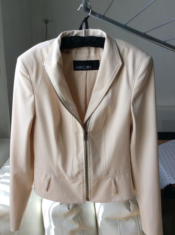 Стильний світло - бежевий укорочений блейзер від Marc Cain,оригінал. Приталений Жакет, з довгим рукавом, на підкладці, без кишень, застібка на брендований замок до середини грудей. Не ношен, у новому стані, дешево. Вказаний розмір 2, що відповідає розміру M. ПОБІДИ( напівобхват) плечі-40 див., ПОБІДИ груди-44 див., ПОБІДИ талія-39 див., ПОБІДИ нижнього краю-44 див, Довжина по спині-50 см, Довжина рукава-60 див.