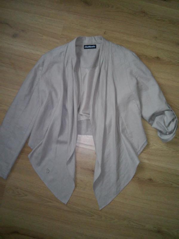 Пиджак Authentic,материал :50% котон,50% лен,рукава подгибаются и подстегиваются на пуговицу до длины 3/4,воротник стойка переходит в длинные полы,сзади жакет короткий , до талии,размер 12 европейский,длина по спинке 45 см,длина рукава 61 см,плечи 42 см.