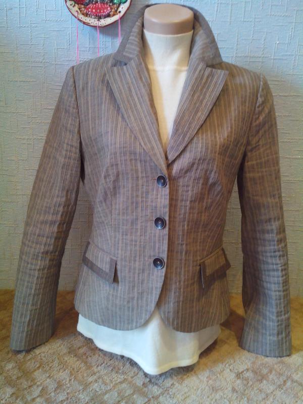 Пиджак в мелкую полоску .Коттон + Лен. Состояние нового,карманы не распороты. Размер 40. Замеры: ПОГ-50, ПОТ-45, по низу-48, плечи- 41,длина сзади-57, рукав- 62/44.