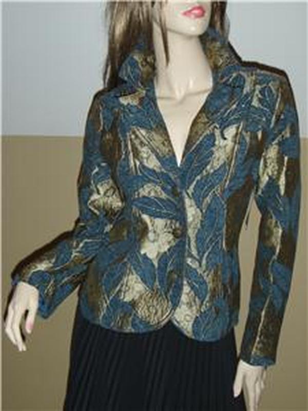 Красивый оригинальный пиджак от американской компании Erin London Плотная, почти пальтовая ткань из поли-компонентов, выглядит как гобелен. На синем фоне вытканы крупные золотые цветы. Фасон приталенный, с вертикальными вытачками впереди и сзади. Красивые металлические пуговицы. Пиджак оживит и украсит любой однотонный наряд. ПИДЖАК АБСОЛЮТНО НОВЫЙ, С ЭТИКЕТКОЙ. Маркировка S, но большемерит. Примерно на наш 46 размер Смотрите мерки! Длина по спинке 58 см, между подмышками 50 см, ПО талии в застегнутом виде 44 см, ПО низа (бедра) 51 см. Длина рукава 61 см, внутрення длина рукава (от подмышки 47.5 см, плечи 40 см. Дополнительные мерки сниму ,если понадобится. С удовольствием отвечаю на Ваши вопросы!