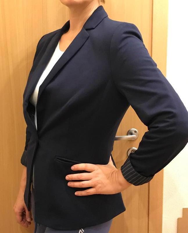 Продаю чудовий піджак, жакет або блайзер на всі випадки життя темно-синього кольору, H&M, розмір производиителя 44, на наш приблизно 48 (для кращого розуміння будь ласка орієнтуйтеся на заміри нижче), новий з етикетками. Підходить під будь-який образ: в офіс з сорочкою, поверх футболки з джинсами або чіносамі і т. д., - варіантів мільйон. Можна носити з довгим рукавом загорнути на 3/4. Шикарний і зручний. Така універсальна річ - must have гардероба будь-якої дівчини. Причина продажу: дубль. Продаю за ціною покупки (29,99 євро) Піджак приталеного силуету на спинці подкройной для кращого облягання, на 1 гудзику, з лацканами та смугастої підкладкою, спереду 2 прорізних кишені, ззаду - розріз по низу для більш зручної посадки. Можна носити як з довгим рукавом, а можна загорнути рукав і вийде рукав 3/4 з ефектною синьою підкладкою на вилозі рукава. Тканина піджака еластична (склад: верх 76% полтэстер, 19% віскоза, 5% еластан, підкладка 100% поліестер) за рахунок чого піджак відмінно сідає по фігурі. Заміри: Довжина по спинці = 65 см ПОГ пахвами = 49-50 см ПОТ = 43-44 см ПОБІДИ = 49-50 см довжина рукава від плеча = 62 см довжина розрізу на спині за дні = 15 см Інші виміри на запит.