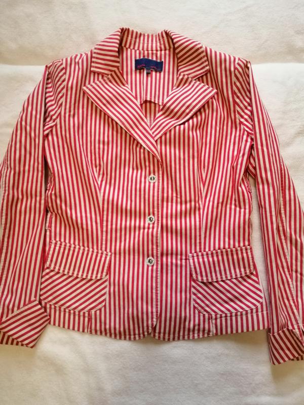 Пиджак в полоску, цвет красно-белый, пуговицы на магнитах, с карманчиками, рукава с отворотами, размер 44,в очень хорошем состоянии Длина 58 см, ширина 43,хорошо сидит и тянется