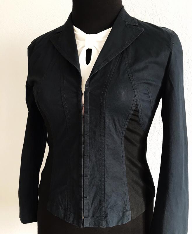 Легкий пиджачек всемирно известного премиум бренда. Крой приталенный, застегивается на крючки. По бокам вставка - сетка {тянется}. Размер n3. Замеры: длина по спинке от воротника -55, плечи-42, рукав- 54 {можно подкатить 3/4 оч стильно смотрится}, по подмышкам -47, по низу пиджака-49.
