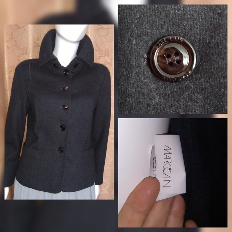 классный пиджак жакет куртка Стильная вещь Marc Cain оригинал размер наш 46-48 Заміри: Довжина 60см Плечі 39-40см Пог 50см Пот 46-47см Низ півобхват 53см Рукав від горловини 67см состав: 90% шерсть 10% кашемир состояние идеальное цвет черно-серый на пуговках ворот можно делать по разному подклад только в рукавах пуговки все с оттиском бренда.