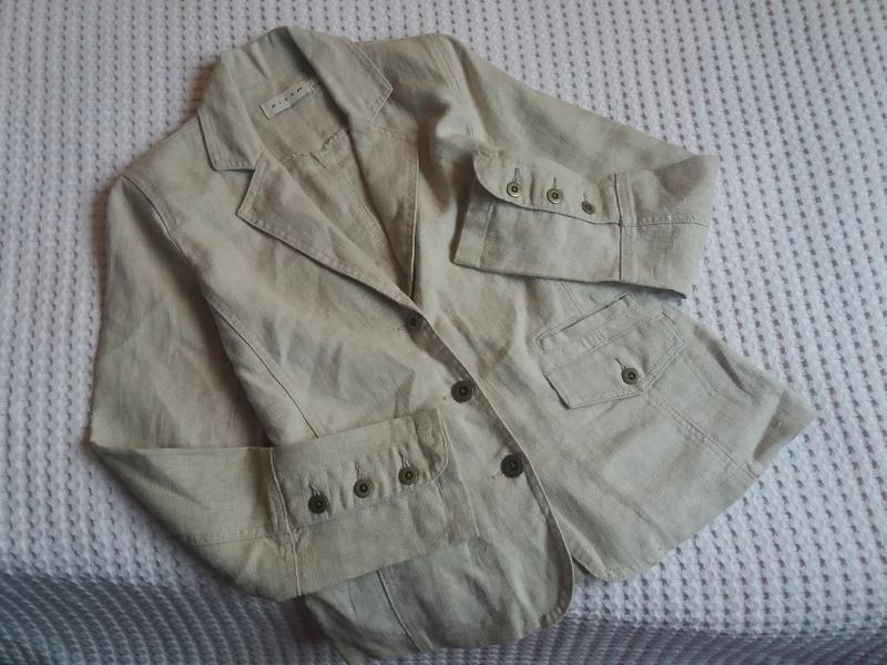 состояние нового.без дефектов. размер указан С, отлично садится на М. материал очень похож на лён, но это 100% рами, азиатская крапива. материал считается лучше за хлопок и лён. просто невероятная вещь! плотный и очень качественный. есть подплечники, можно снять. металические пуговки. длина 60, плечи 36-37, пог 47-48, пот 41. рукав 62.