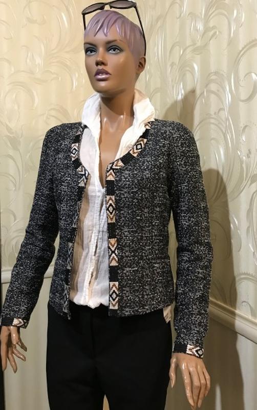 Жакет/пиджак черно-белого цвета, прямого, укороченного, слегка приталенного кроя, по бокам имитированные прорезные карманы, полностью на подкладке, застегивается на один верхний крючок, рукава, ворот и планка декорированы орнаментом. Бренд MAISON SCOTCH (SCOTCH&SODA). Maison Scotch - женская линейка SCOTCH&SODA была запущена, когда женщины неоднократно были замечены в предметах одежды, предназначенных для мужчин. Состав: изделие - 61% полиэстер, 39% хлопок; подкладка - 96% полиэстер, 4% эластан. Размер 2/М. Состояние идеальное. Замеры: плечи - 36 см., ПОГ - 47/48 см., ПОТ - 41 см., ПОниз - 44 см., длина от плеча - 54 см., длина рукава: внешняя - 64 см., внутренняя - 47 см. Размер манекена S. Добро пожаловать в наш магазин. Известные бренды, отличное качество - доступные цены.