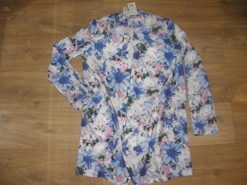 Красивый, удлиненный жакет George в красивейший цветочный, весенний принт. Вещь не только красивая, но и стильная - под джинсики, мокасины прсто вау! По бокам кармашки. Новый, с биркой. Размер 10 или 38. Длинна 77 см, ширина по спинке 48-49, рукав 61.
