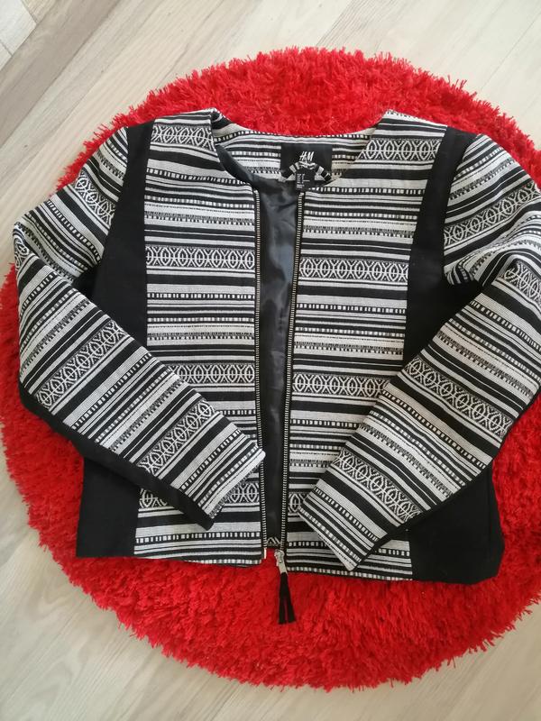Практичный плотный деловой повседневный пиджак известного бренда. Застежка молния, карманов нет, на подкладке. В составе полиэстер, коттон, вискоза. Размер М(38)