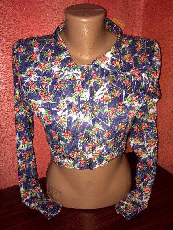 Болеро в цветочный принт в идеальном состоянии, дефектов нет. Джинс не плотный, застегивается на кнопки. Принт яркий. Размер S. Длинна 35 см. Рукав 57 см. Ширина род рукавами 46 см.