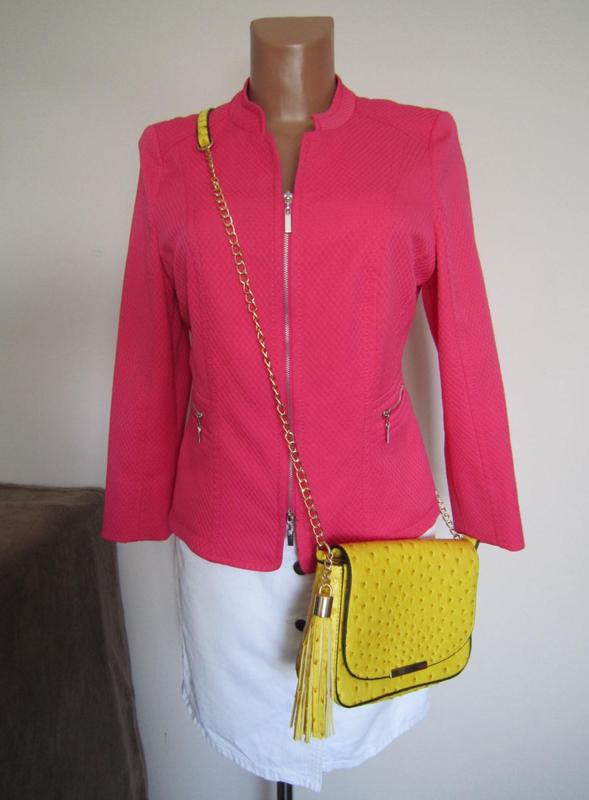 Дуже стильний піджачок на замочку від Gerry Weber неоново-рожевого кольору ( в реальності світліший відтінок, світлий теплий неоново-рожевий колір)) Замок розстібається у двох напрямках: знизу-догори і зверху-вниз, такох карманчики на замочку, але кармани лише декоративні. Піджак без підкладки, тому сам по собі легкий і підійде на теплу погоду, також має м'якенькі надплічники)) Стан ідеальний, лише відсутня бірка зі складом тканини і розміром, тому орієнртуйтесь по замірах: ПОГ 48 см ПОТ 43 см Довжина 56 см (Сумка на фото продається також)) За додатковою інформацією звертайтесь в приват))