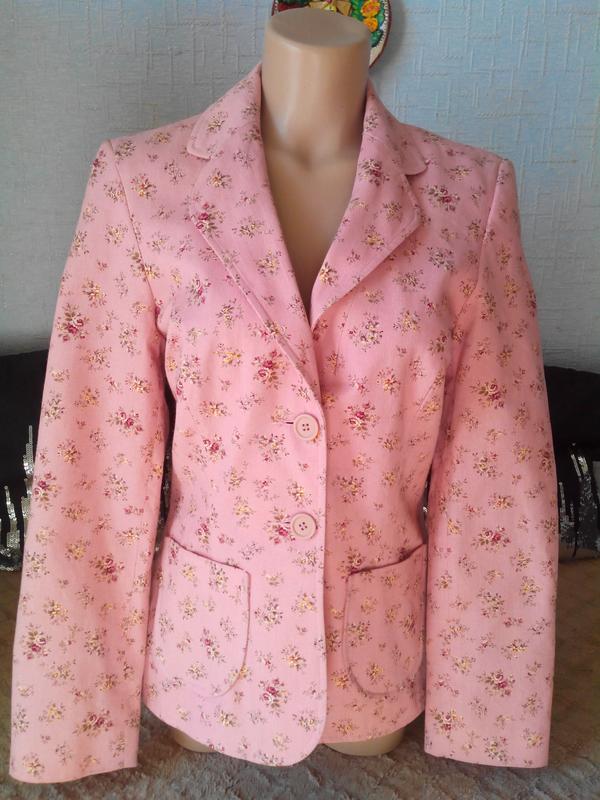 ❗Я НЕ работаю по "Безопасной оплате". Оплата 100% на МОЮ карту Приватбанка или Наложенным платежом по предоплате 100-200 грн(зависит от веса и стоимости товара). Отправка сразу после оплаты НП или Укрпочтой. Нежный розовый пиджак в цветочный принт от KIT. Размер 12,евро 38 ( наш 46 ). ЗАМЕРЫ: ПОГ-44, ПОТ- 41, ПО по низу-46, плечи-40, длина по спинкн-63, рукав-60/43. 100% коттон. Состояние идеальное.