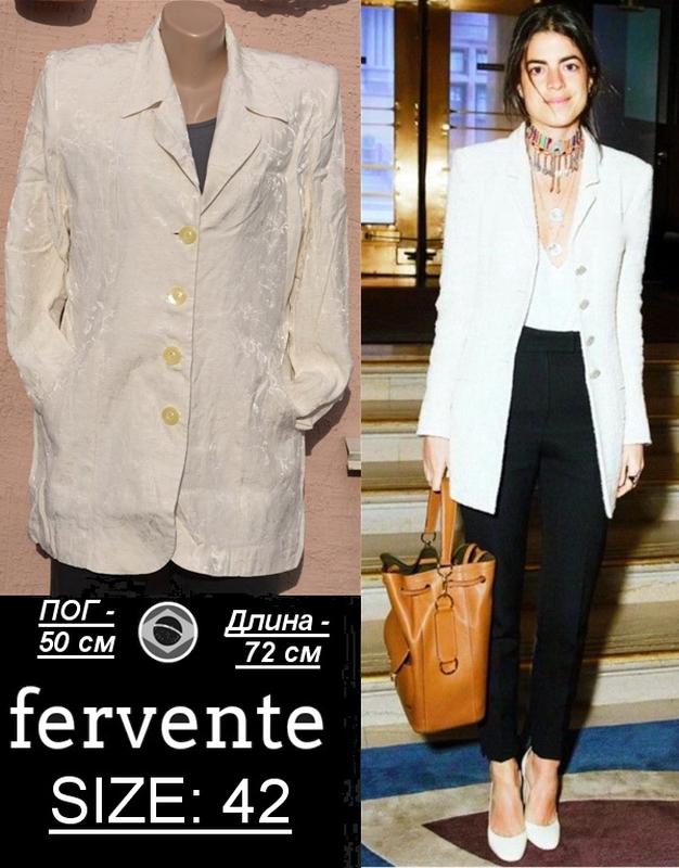 С новыми веяниями в моде меняются женские вкусы и предпочтения, но есть вещи, которые не теряют своей актуальности никогда и остаются неизменными❗ Вещи, которые могут нам прослужить не один год, ценятся в большей мере❗ Удлиненный жаккардовый пиджак-френч ванильного цвета приталенного кроя от итальянского бренда FERVENTE – такая модель всегда в моде, она встречается во всех сезонах – весной, летом и oceнью❗ SIZE: 42 ПАРАМЕТРЫ ИЗДЕЛИЯ, в лежачем спокойном состоянии: ПОГ - 50 см; ПОТ - 46 см; ПОБ - 52 см; по боках есть 2 прорезных кармана; длина рукава - 55 см; ширина плеч вверху - 41 см; длина изделия - 70 см. Приталенный пиджак-френч идеально подчеркивает женскую фигуру, плавно очерчивая ее изгибы. Даже если у вас есть какие-либо недостатки, которые вы желаете скрыть, вам все равно удастся подобрать приталенный фасон, благодаря стараниям модельеров.