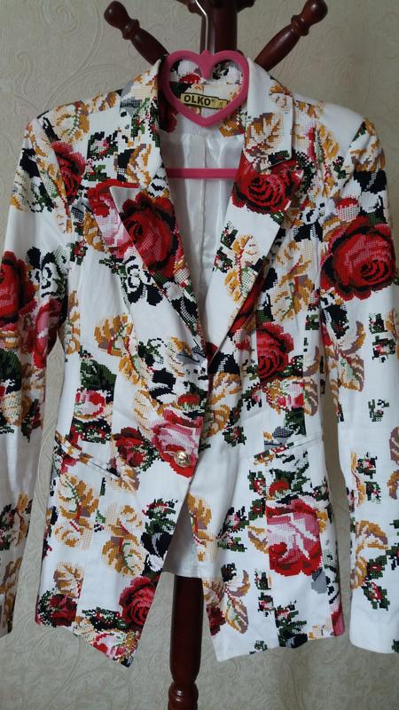 Яркий цветастый летний пиджачок на подкладке 42-44 размера с застежкой на одной пуговице. Olko. Длина пиджачка по спинке 61 см. Спереди низ длиннее. На пиджачке имитация вышитых цветов и прорезных карманов. Воротник откладывается. Состав: 65% коттон 35% полиэстер.