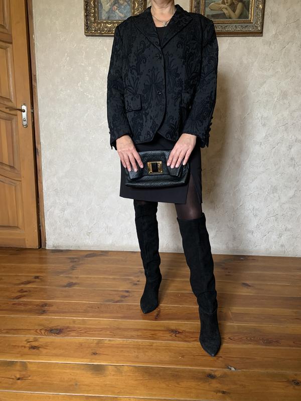 Бренд люкс .Гарний жакет з унікальними гудзиками .Дуже гарний вибитий малюнок . Плечі по спинці 44,5.довжина рукава 56.загальна довжина 60.с комірцем 64.