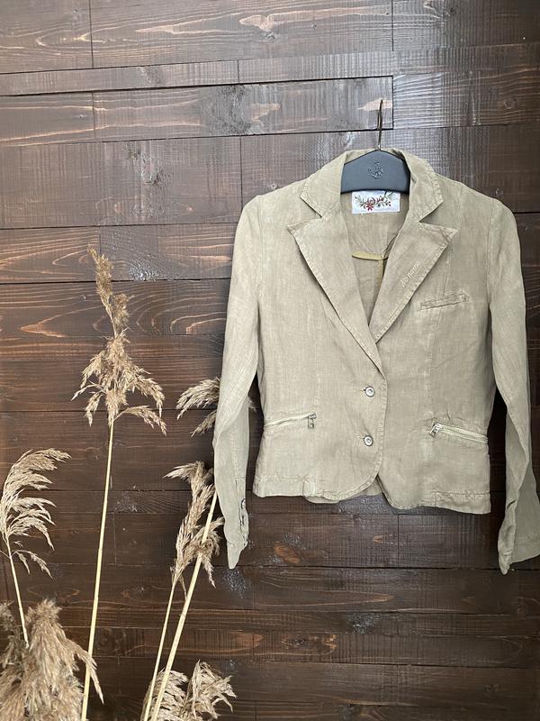 Качественный льняной пиджак классического фасона/ Подойдет на xs s m европейский может быть как оверсайз: Цвет серо-бежевый/ Подкладки нет. Длина 53 см/ Плечи 38 см/ Рукав 59 см/ Пог 46 см/ Знизу 45 см/ Продается как есть без возврата/ Материя обладает красивой и оригинальной текстурой. Лен дает приглушенный легкий блеск, отличается матовым финишем. многих интересует, лен тянется или нет? На самом деле, среди особенностей материала нет эластичности, однако некоторые виды (например, стретч) могут немного тянуться. Имеет аккуратные узелки, которые препятствуют полному проникновению света через полотно. Из-за этого лён активно используют даже при создании блэкаут штор.