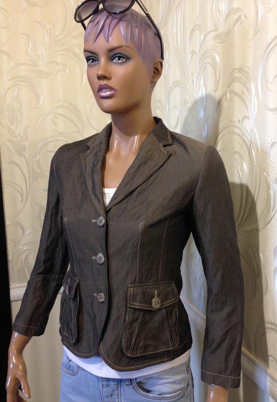 Пиджак коричневого цвета, укороченного, слегка приталенного кроя, впереди два накладных кармана, застегивается на три пуговицы, рукав 3/4, полностью на подкладке. Состав: 41% нейлон, 34% бамбук (бамбуковый лен), 19% хлопок, 6% металлизированная нить; подкладка - 100% ацетат. Размер 34/XS-S. Состояние очень хорошее, без нюансов. Замеры: плечи - 38 см, ПОГ - 44 см., ПОТ - 38 см., низ - 45 см., длина - 54 см., длина рукава: внешняя - 53 см., внутренняя - 39 см. Размер манекена S.