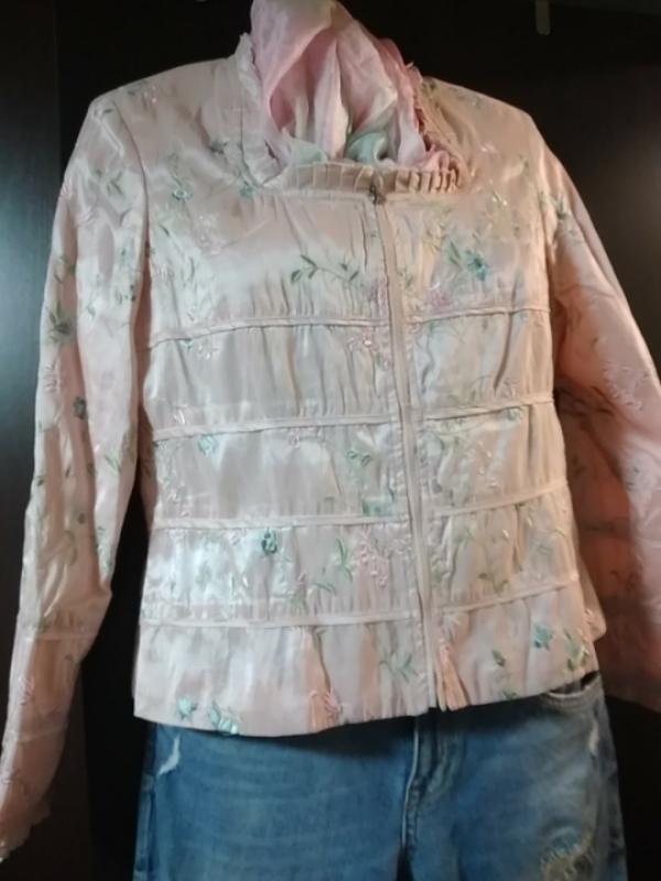Пиджак жакет нежно розовый размерM. бренд NABI.Новый стоковый жакет для модниц. ПОГ 50см, ПОТ 45см, ПОБ 46см, Плечо 12см, Дл рукава 59см, Дл по спинке 55см. Пиджак атласный, нежно розового цвета, с красивейшей вышивкой, на молнии, 100% полиэстер.Нарядная одежда в вашем гардеробе! Внимание!!! ( платье одето на манекен с параметрами ПОГ=52см,ПОТ=32см,ПОБ=44см,ПОплеч=47см, Длинна манекена 66см) Добро пожаловать в наш магазин. 100% оплата на карту банку. Пересылка Украиной НП, Укр-почтой