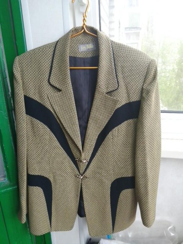 Пиджак женский, размер 48-50, замеры длина по спинке - 70 см, по груди - 54см, плечи - 47см, длина рукаваот плеча-62см, длина рукава от подмышки - 38 см, ширина рукава на выходе - 15 см, цвет горчица с чёрным