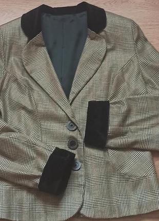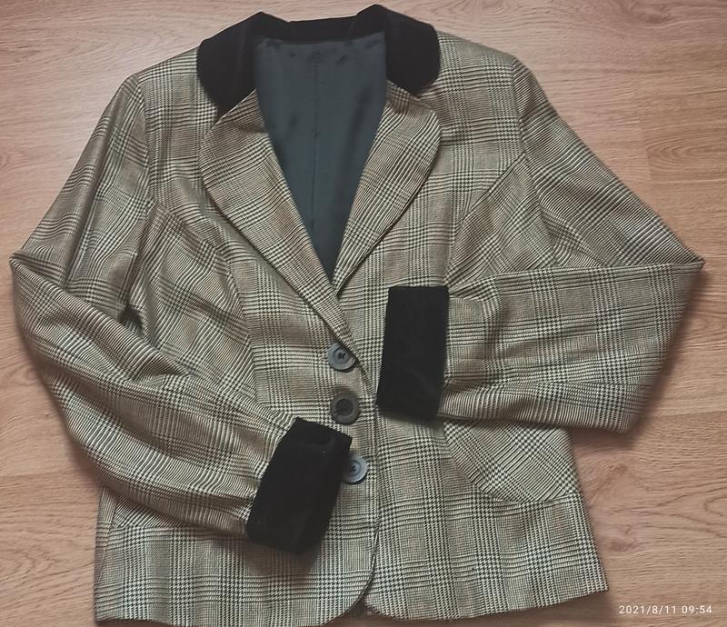 стильний актуальний піджак. шитий на замовлення. розмір приблизно 46-50 наш). тканина дуже гарна, комір і манжетки - велюр. кишень немає. довжина - 63см. рукав 65 см, ОГ - 52см. ОТ - 47см.