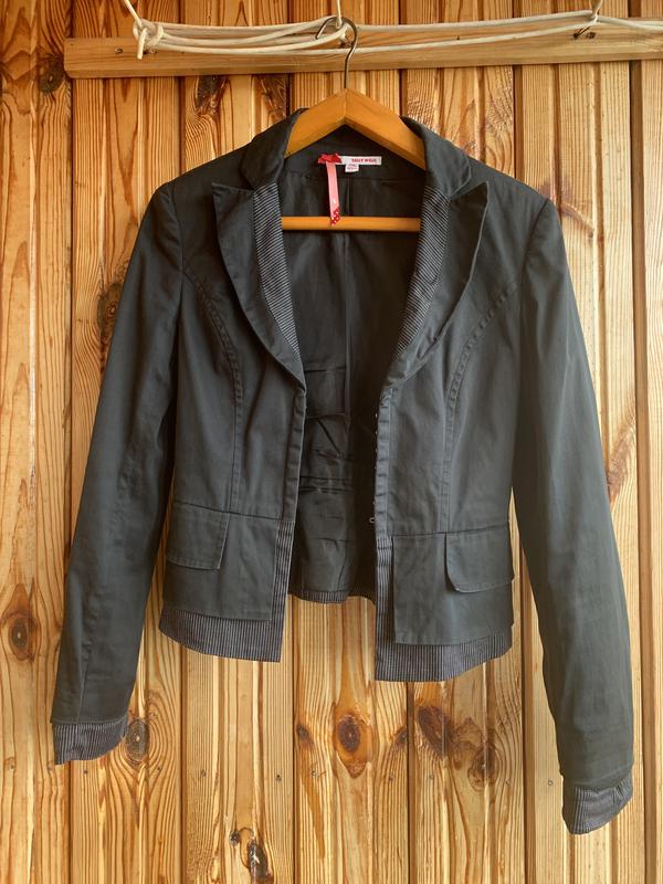 Приталенный пиджак с отделкой в полоску 97% хлопок, хорошее состояние Подкладка 100% полиэстер Размер М/38, но сидит больше как S Длина -48см Подмышка от подмышки -42см Талия -36см Рукав -64см