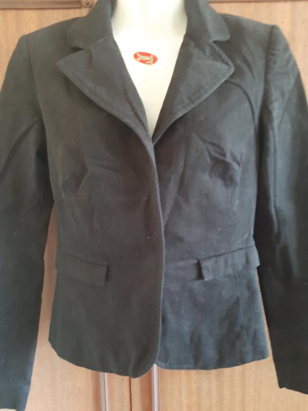Пиджак черного цвета,в хорошем состоянии,карманы закрыты клапаном,на подкладке.Замеры: ПОГ-44см.,длина-54см.
