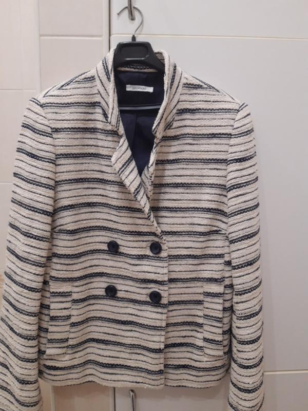 светлый пиджак бренда Promod. Плотный, хорошо держит форму, с подкладкой, в отличном состоянии. Двубортный, светлый с темно-синей полоской и тоненькой, еле заметной люрексовой ниточкой. Отличный состав 94 хлопок, 5 полиэстер. Не мнется. Ширина по плечам 37 см, длина рукава 60 см, расстояние между подмышками 47см, длина пиджака 56см