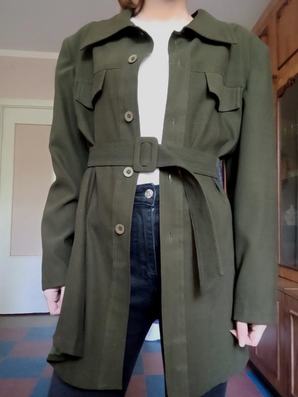 Тканевый удлиненный пиджак с поясом. На пуговицах. С подкладкой. Цвет - темный хаки (бутылочный). Размер 46. На фото надет на XS.
